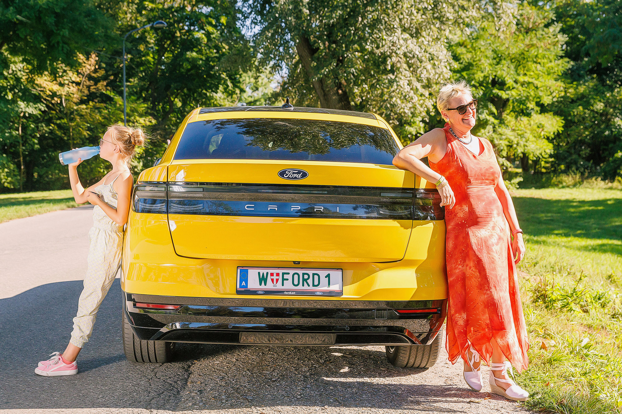 Wir hätten das kultigen gleichnamige Kindergetränk zum Fototermin mitnehmen sollen – die Idee kam uns leider erst, als Diana schon mit ihren Schulbüchern den Ford Capri erklommen hatte. Sei's drum: Doris und Diana, fixer Bestandteil unserer Familienautos-Familie und alte Hasen beim Fotoshooting, hatten ihre sonnenhelle Freude am diesjährigen Testauto. Gelb ist Dianas Lieblingsfarbe, das Safterl trinken beide ganz gern – und der Onkel ist auch so einen gefahren. Den von damals, aus den 70ern.