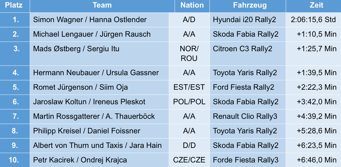 Sieger Simon Wagner (Hyundai i20 Rally2): „Ich bin schon so oft drauf angesprochen worden, dass ich diese Rallye noch nicht gewonnen habe. Das hört jetzt endlich auf. Innerlich habe ich immer gewusst, dass ich sie hätte gewinnen können, aber irgendwie ist es sich dann doch nicht ausgegangen. Jeder, der hier schon gewonnen hat, weiß, dass das etwas ganz Spezielles ist. Dass ich nun endlich auch dieses Gefühl genießen kann, ist einfach nur schön und ich bedanke mich bei allen, die dazu beigetragen haben!“