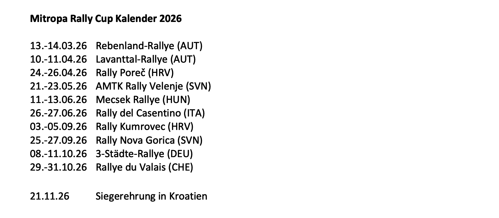 Am Freitag den 13.3. startet der Mitropa Rally Cup (MRC) mit der Rebenland-Rallye in der Südsteiermark in seine 61. Saison. Von den insgesamt 61 teilnehmenden Mannschaften sind 21 Teams in den Mitropa Rally Cup eingeschrieben.