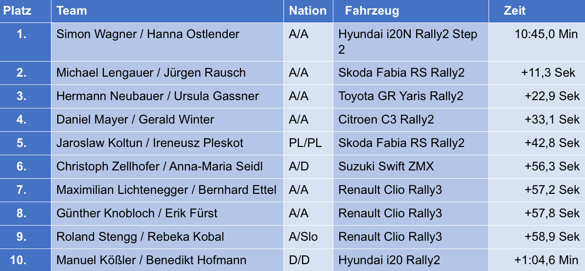 Die 48. LASERHERO Lavanttal-Rallye in Wolfsberg ist gestartet. Und wie!? Staatsmeister Simon Wagner unterstrich mit zwei Bestzeiten in der neuen SP Winkling – Reisberg und SP Arlinggraben seine Favoritenstellung in der Klasse TEC7 ORM. Mit dem Hyundai i20 des Oberösterreichers konnte keiner des restlichen Feldes so richtig mithalten. Der nach einem Mountainbike-Unfall leicht gehandikapte Michael Lengauer (Skoda Fabia) kam noch am nächsten an den dreifachen Lavanttal-Sieger (2022, 2024 und 2025) heran, weist nach zwei von insgesamt 14 Wertungsprüfungen aber schon 11,2 Sekunden Rückstand auf. Mit Hermann Neubauer im Toyota Yaris Rally2 ist das von vornherein favorisierte Podest momentan perfekt, wenngleich hier der Rückstand von 22 Sekunden auf die Spitze in seiner Dimension doch etwas überrascht.