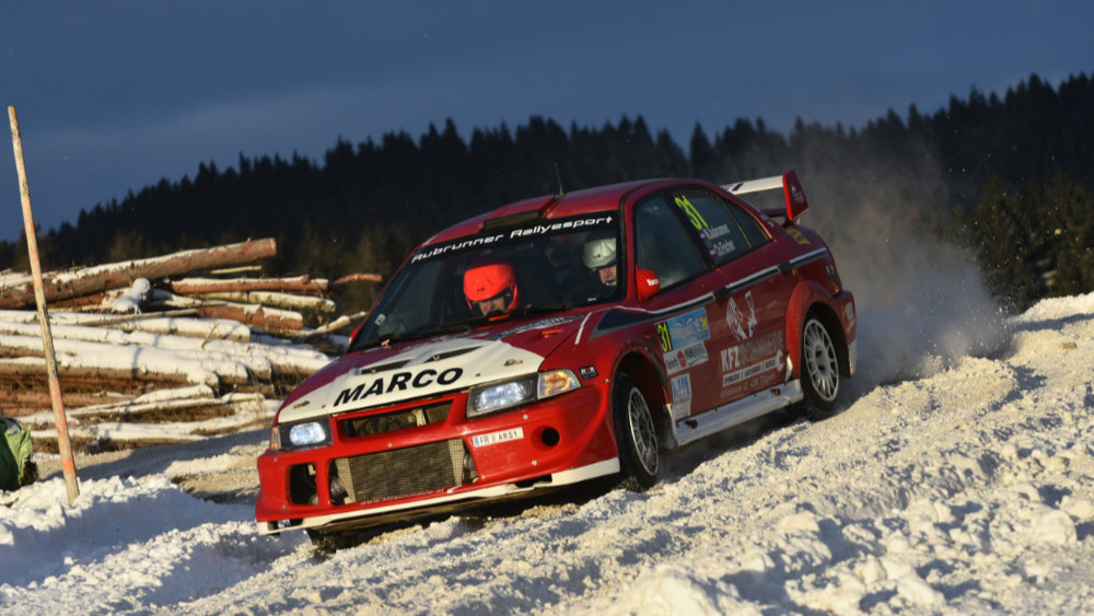 Und so gab Marco heuer seine Jännerrallye-Premiere - mit Copilot Christoph Fischer in einem Mitsubishi Lancer Evo 6.5 Proto. Aubrunner gibt offen zu: „Es war eine Low Budget Rallye für uns. Wir hatten kein Schnee-, also Schotterfahrwerk sondern nur ein Asphaltfahrwerk im Auto verbaut und wir hatten nur vier gebrauchte Takis (schmale Spike-Reifen, Anmerkung) dabei, die wir auch schon bei einem kurzen Test in Ottenschlag verwendet hatten. Beim Shakedown zur Jännerrallye stellte sich heraus, dass sie nicht mehr richtig funktioniert haben.“